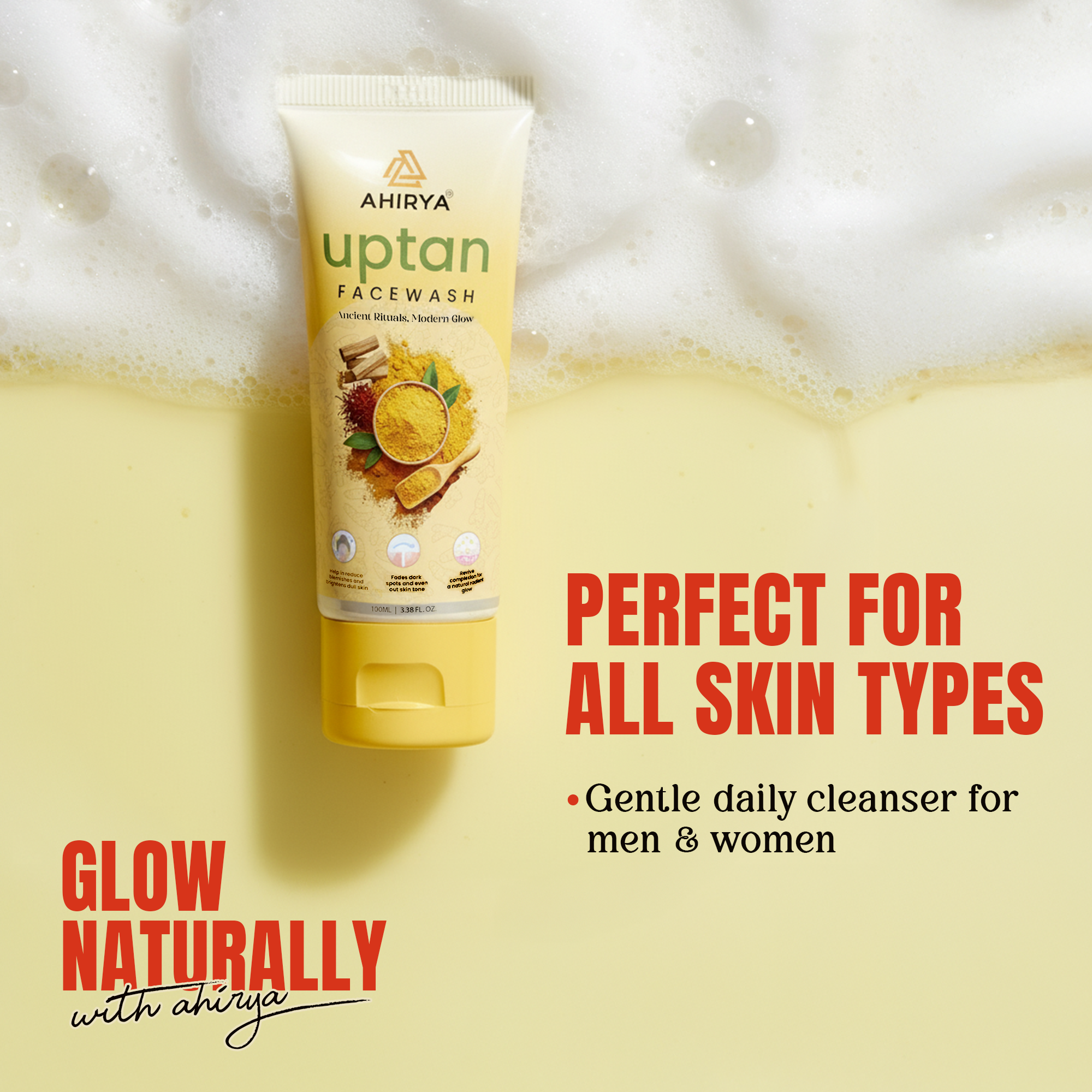 Bring back your skin’s natural radiance with Ahirya Uptan Facewash, inspired by age-old beauty secrets. Enriched with Turmeric, Saffron & Sandalwood, this gentle cleanser removes tan, reduces dullness, and gives your face a healthy, golden glow — every wash, every day!